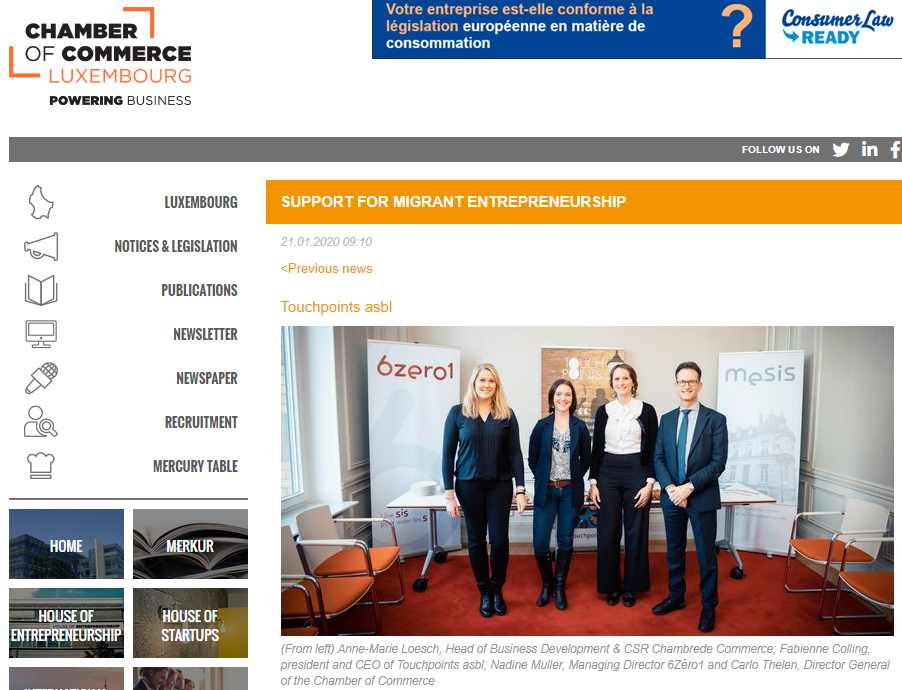 SOUTIEN À L’ENTREPRENEURIAT MIGRANT]]>Chamber of Commerce, Luxembourg.https://www.touchpoints.lu/single-post/2020/01/21/SOUTIEN-%C3%80-L%E2%80%99ENTREPRENEURIAT-MIGRANThttps://www.touchpoints.lu/single-post/2020/01/21/SOUTIEN-%C3%80-L%E2%80%99ENTREPRENEURIAT-MIGRANTTue, 21 Jan 2020 08:30:00 +0000