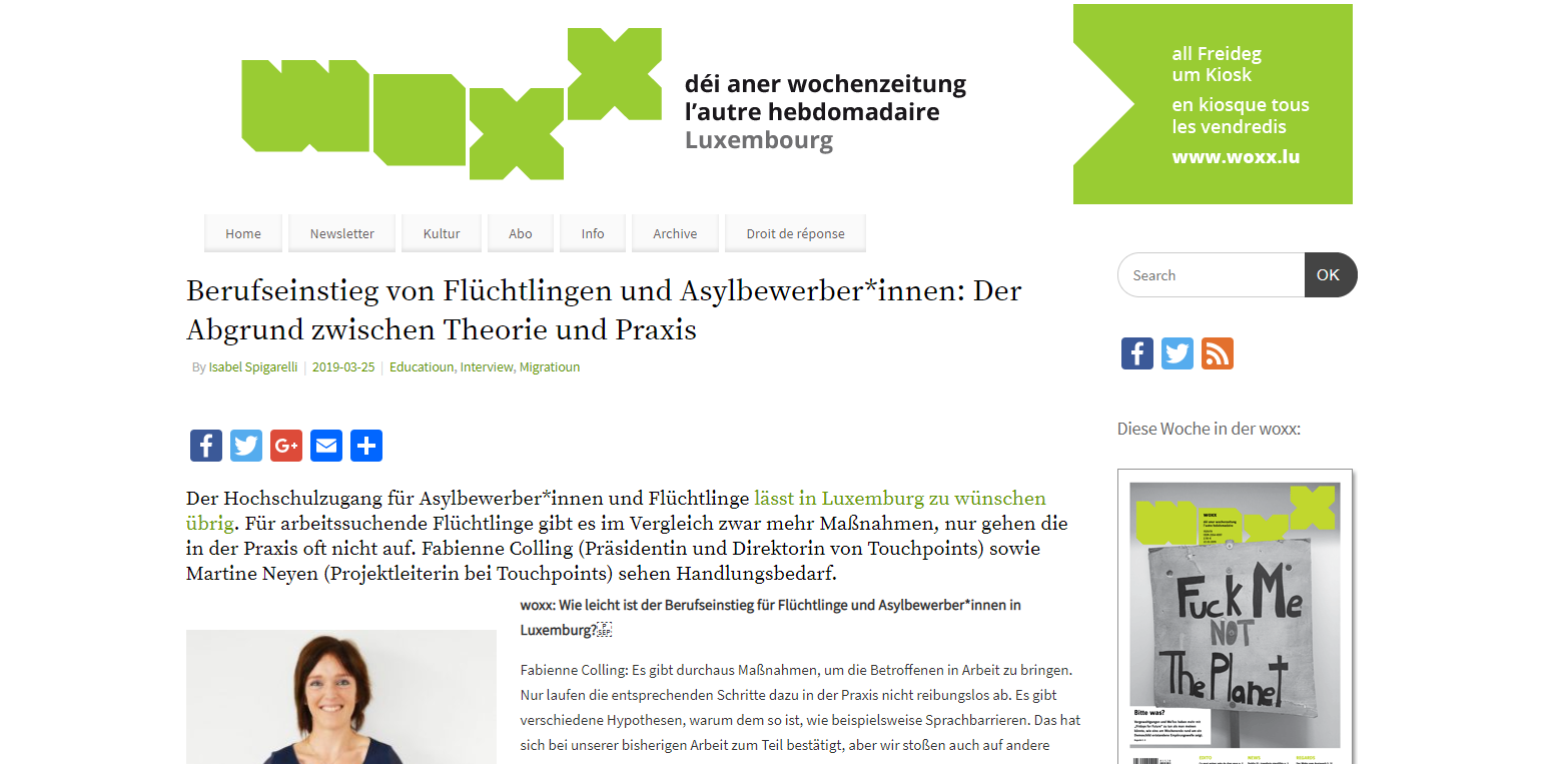 Career entry of refugees and asylum seekers: The abyss between theory and practice]]>Isabel Spigarelli, WOXXhttps://www.touchpoints.lu/single-post/2019/03/26/Career-entry-of-refugees-and-asylum-seekers-The-abyss-between-theory-and-practicehttps://www.touchpoints.lu/single-post/2019/03/26/Career-entry-of-refugees-and-asylum-seekers-The-abyss-between-theory-and-practiceTue, 26 Mar 2019 16:11:50 +0000