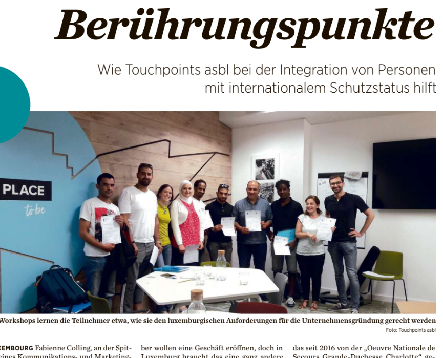 Fondée en août 2016 dans le but d'informer, de former et de soutenir les réfugiés souhaitant se mettre à leur compte au Luxembourg, Touchpoints asbl crée des points de rencontres entre les populations du Grand-Duché de Luxembourg et ses nouveaux arrivants afin de favoriser le vivre ensemble et de consolider ces expériences sur le long terme.